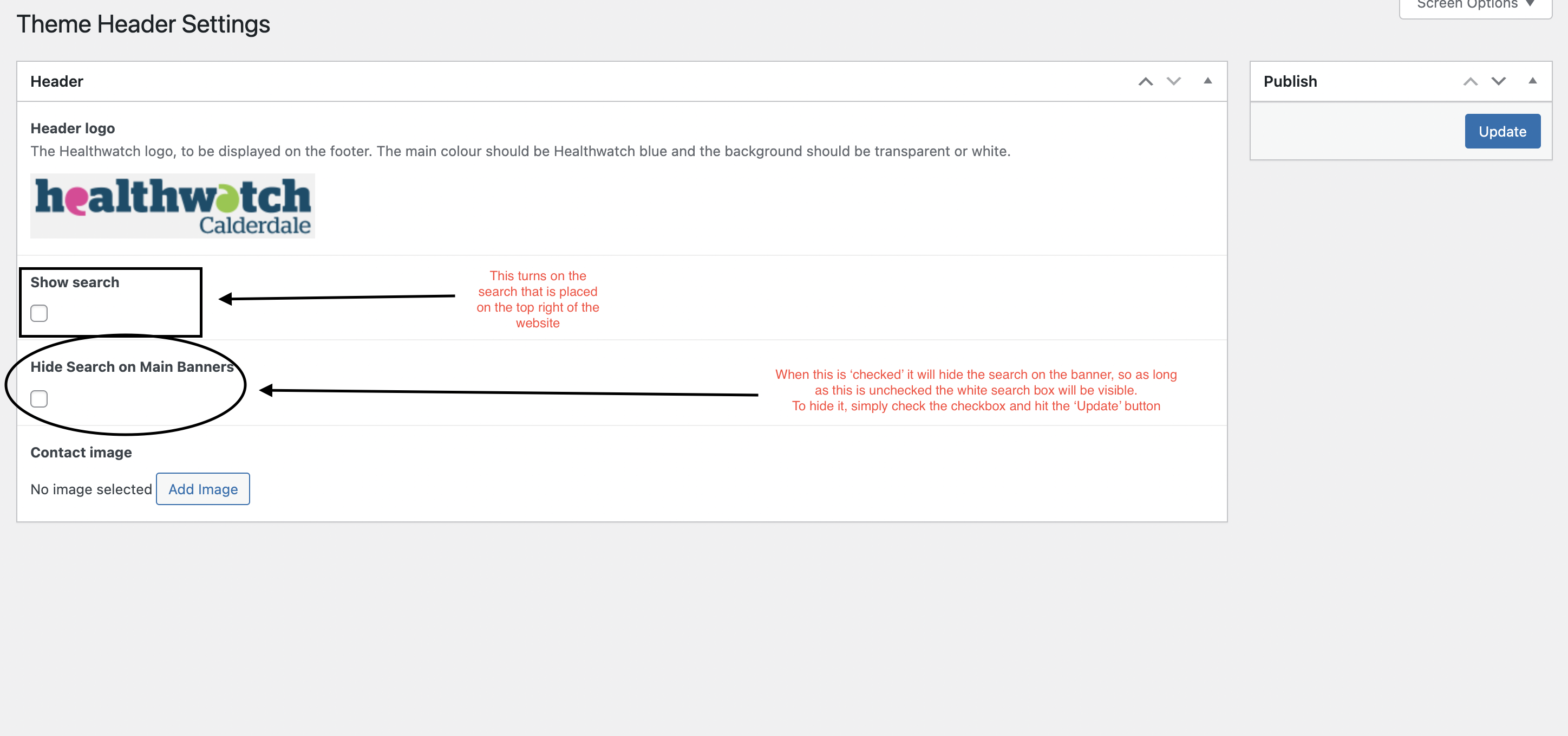 You can control all the header options on this page, including your site logo, search box on the top of the page and adding a contact image. But for now we'll focus on the Search that is shown on the main banner. In the example above, this Search on Main Banner has been turned on so the checkbox hasn't been selected. If the Search Box isn't showing on the main banners on your site, simply head to this page and uncheck that box.