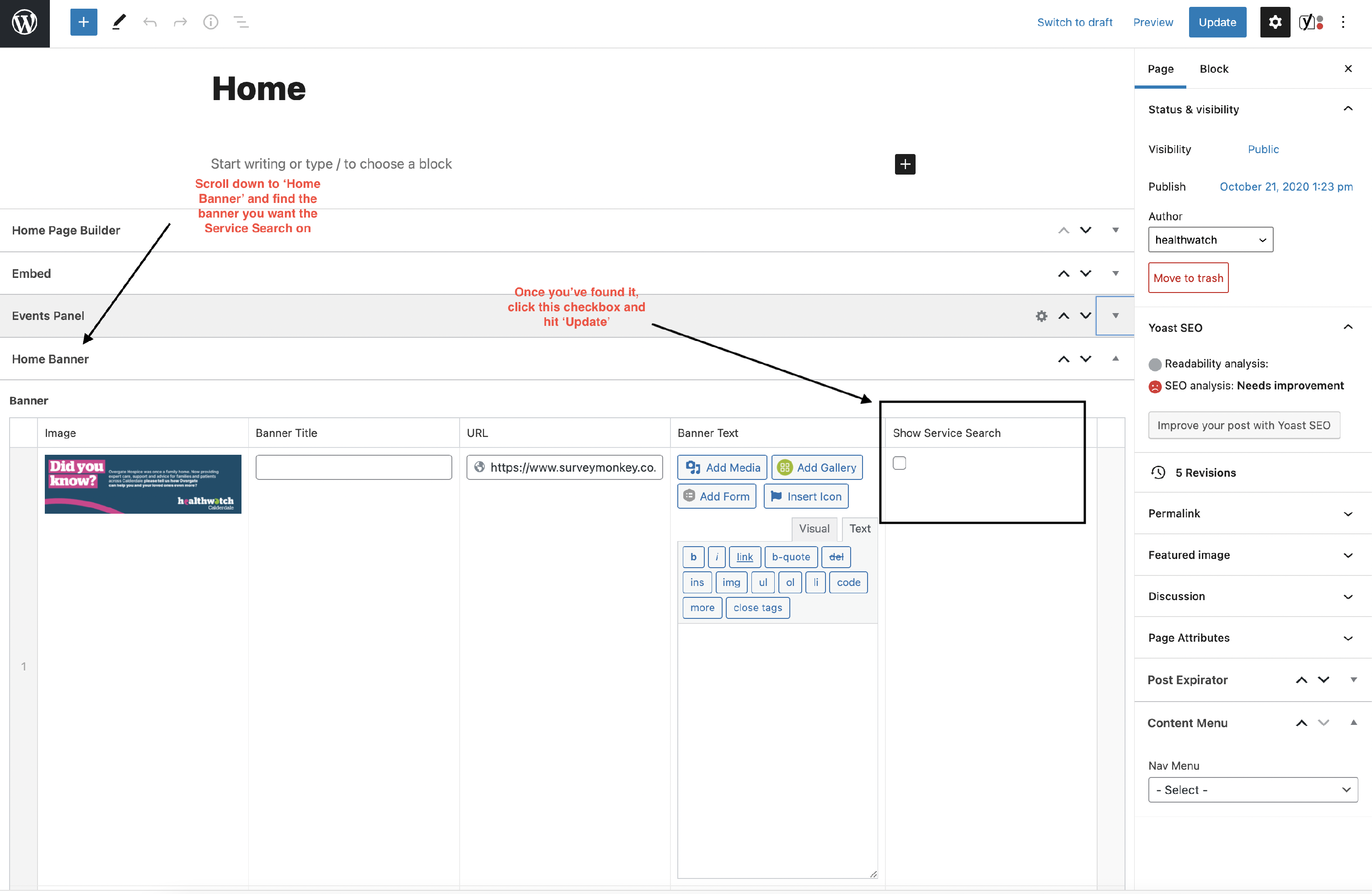 Once you load the Homepage Editor, scroll down to the section that says 'Home Banner', find your banner and click the 'Show Service Search' checkbox. Make sure you hit update and the service search should appear in a blue box on your homepage.