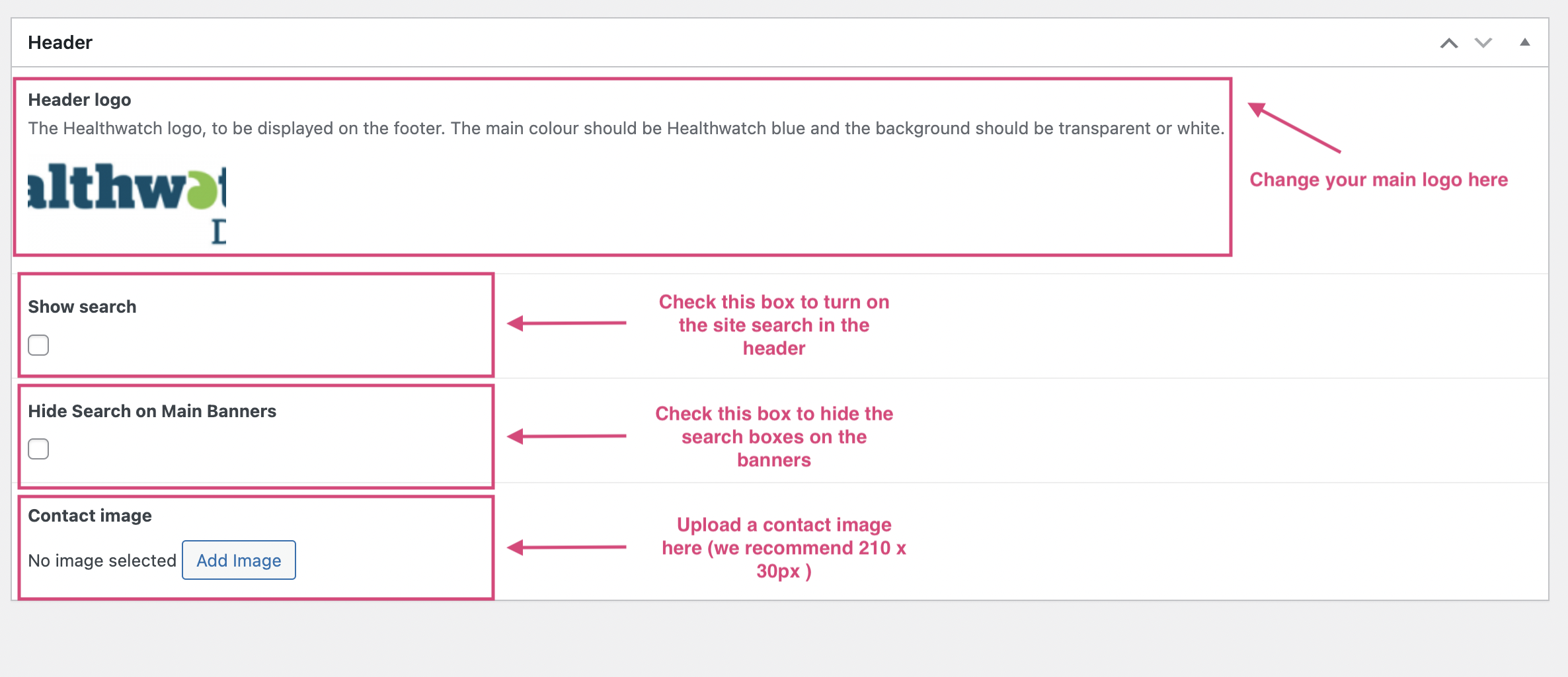 You can change your page header really easy in Wordpress. You can add a logo, show a site search and add a contact image.