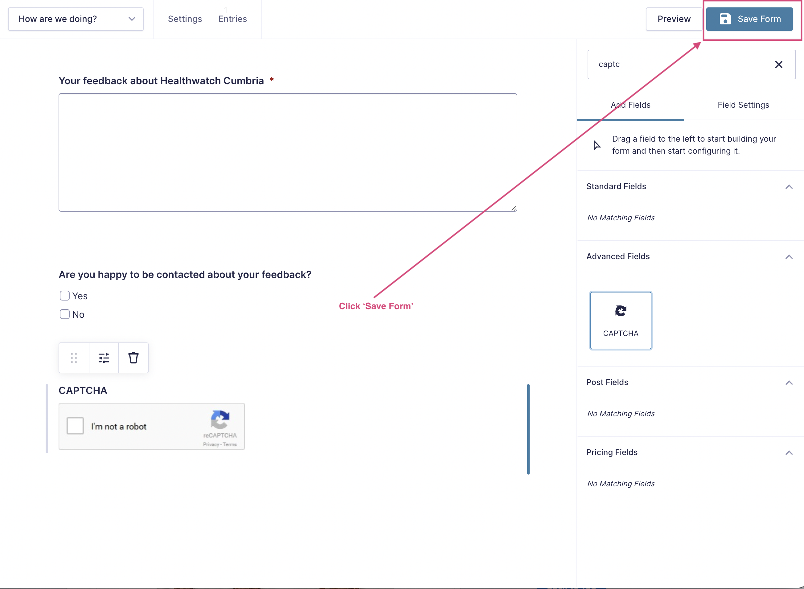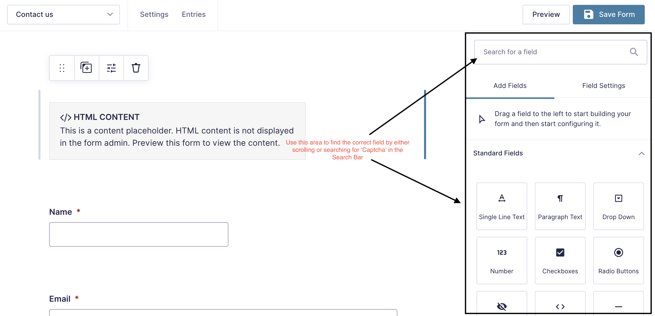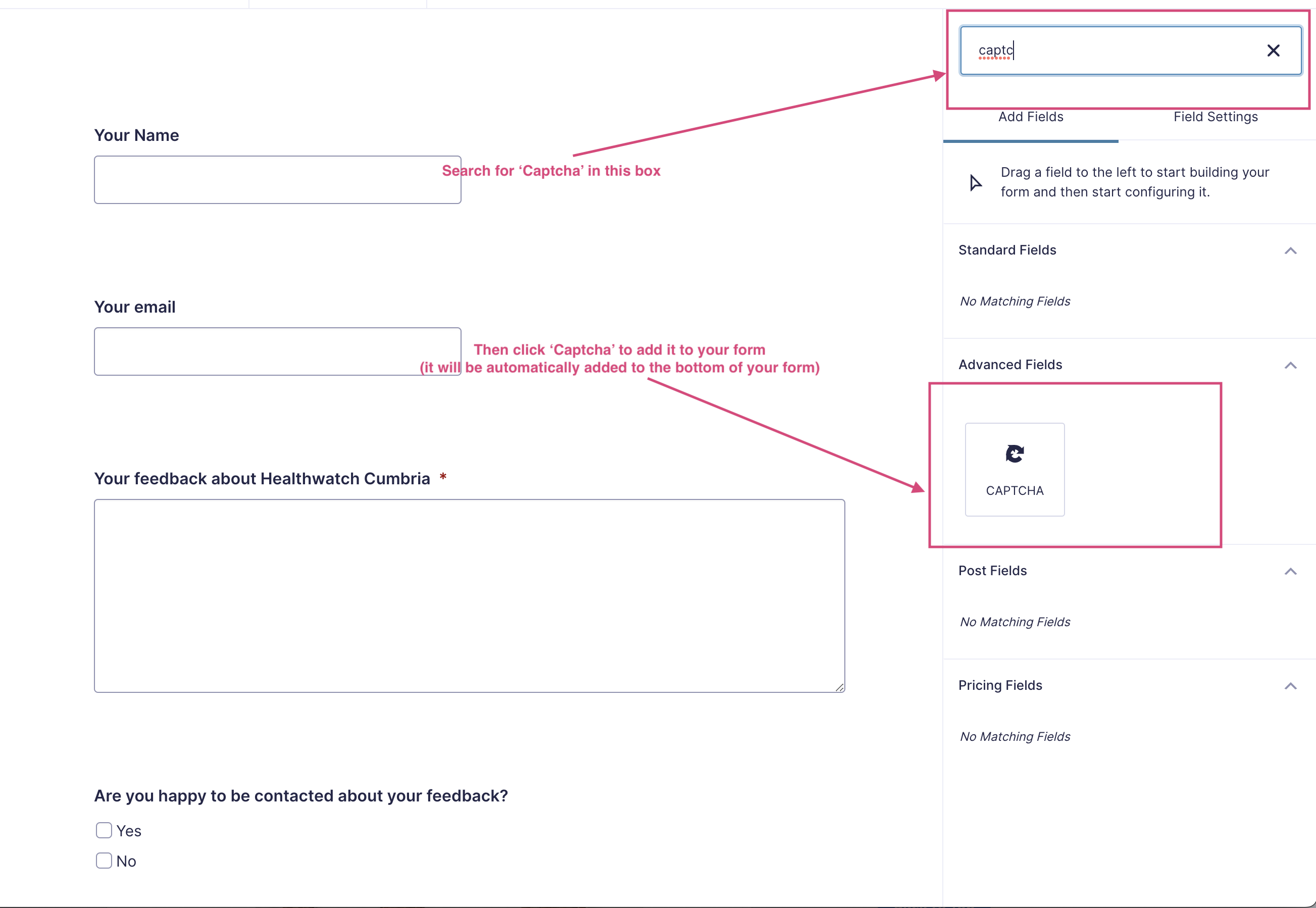 Then click 'Captcha', this will automatically add the captcha to the bottom of the form:
