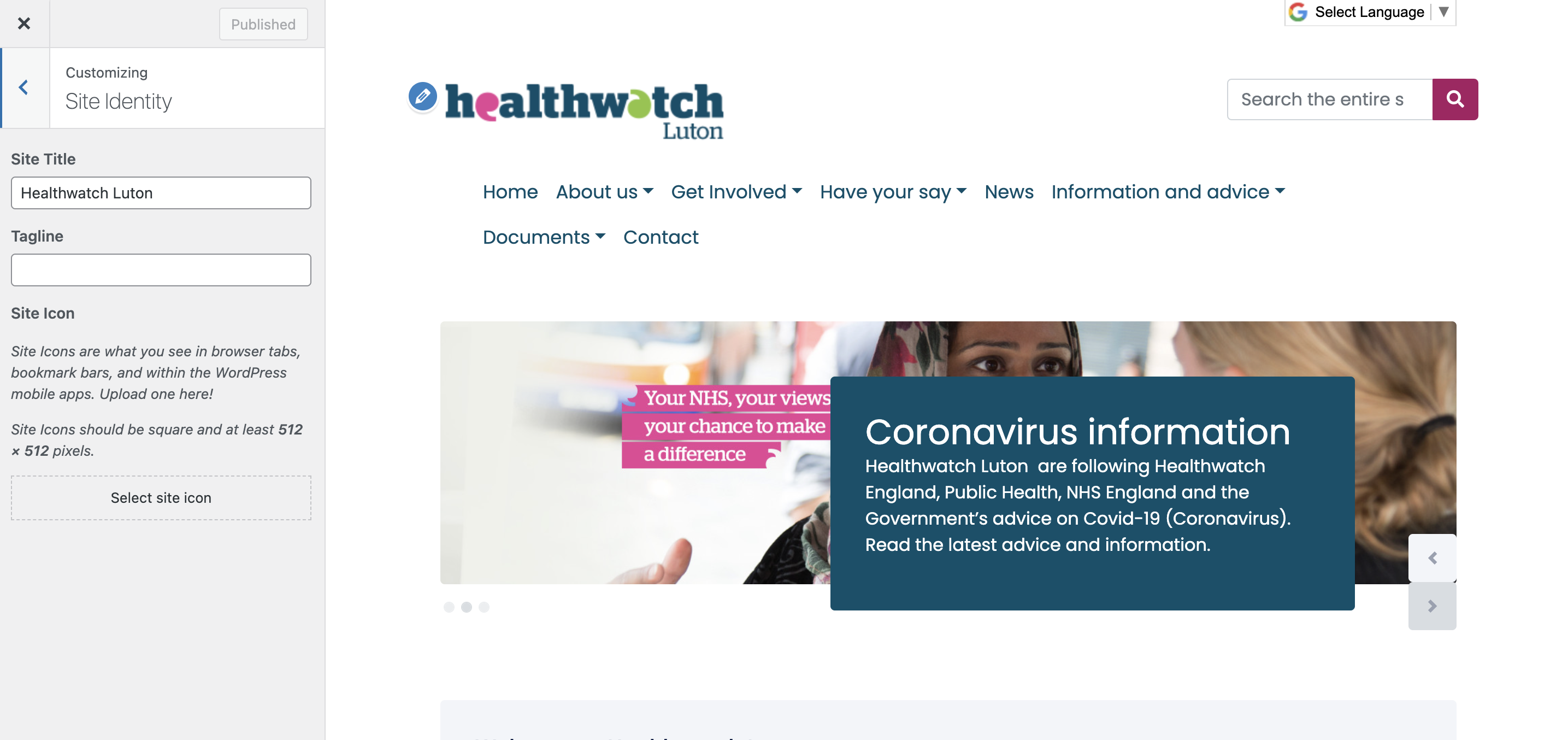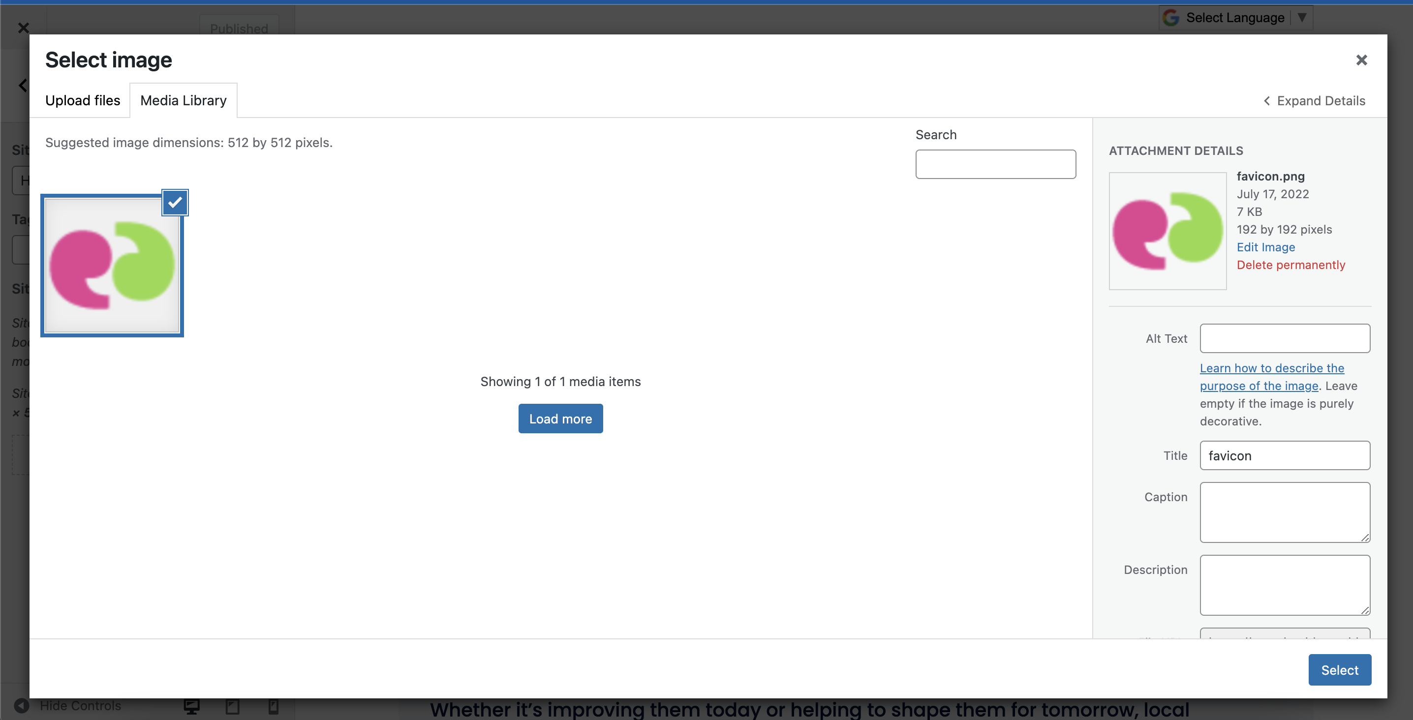 As you can see, you can alter the title of your site, the tagline and the site icon. To upload an icon click 'Select site icon' as a guide, Wordpress recommends that the icon should be square and at least 512 x 512 pixels. Once you've clicked 'Select site icon' the media dialogue should open like so: