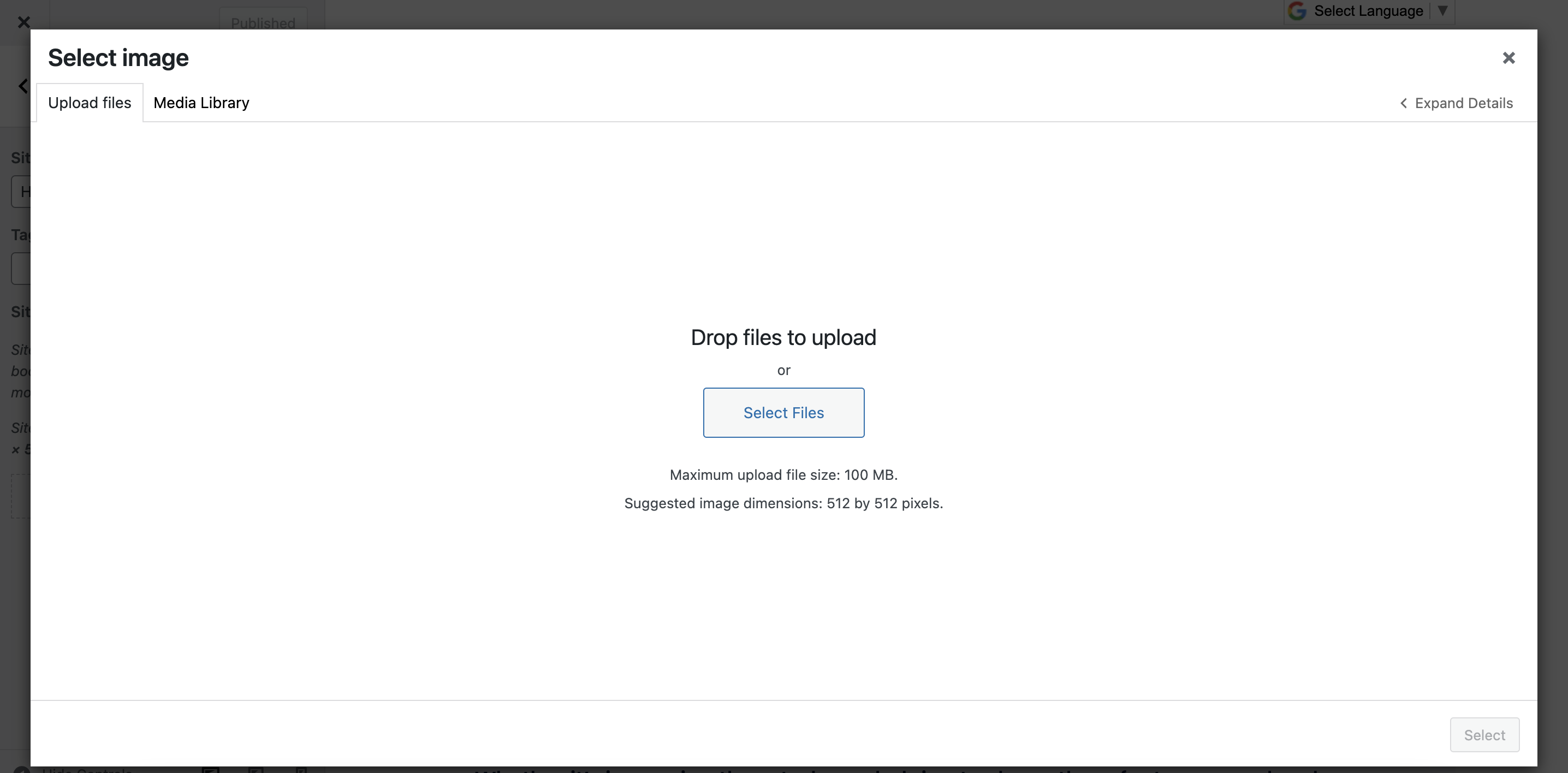 You can either upload or select one from the media library. In this situation we'll upload a new one, so we'll find the icon from our computer and drag and drop it into the upload box, alternatively you can use the Select Files button to find the image in a file viewer.