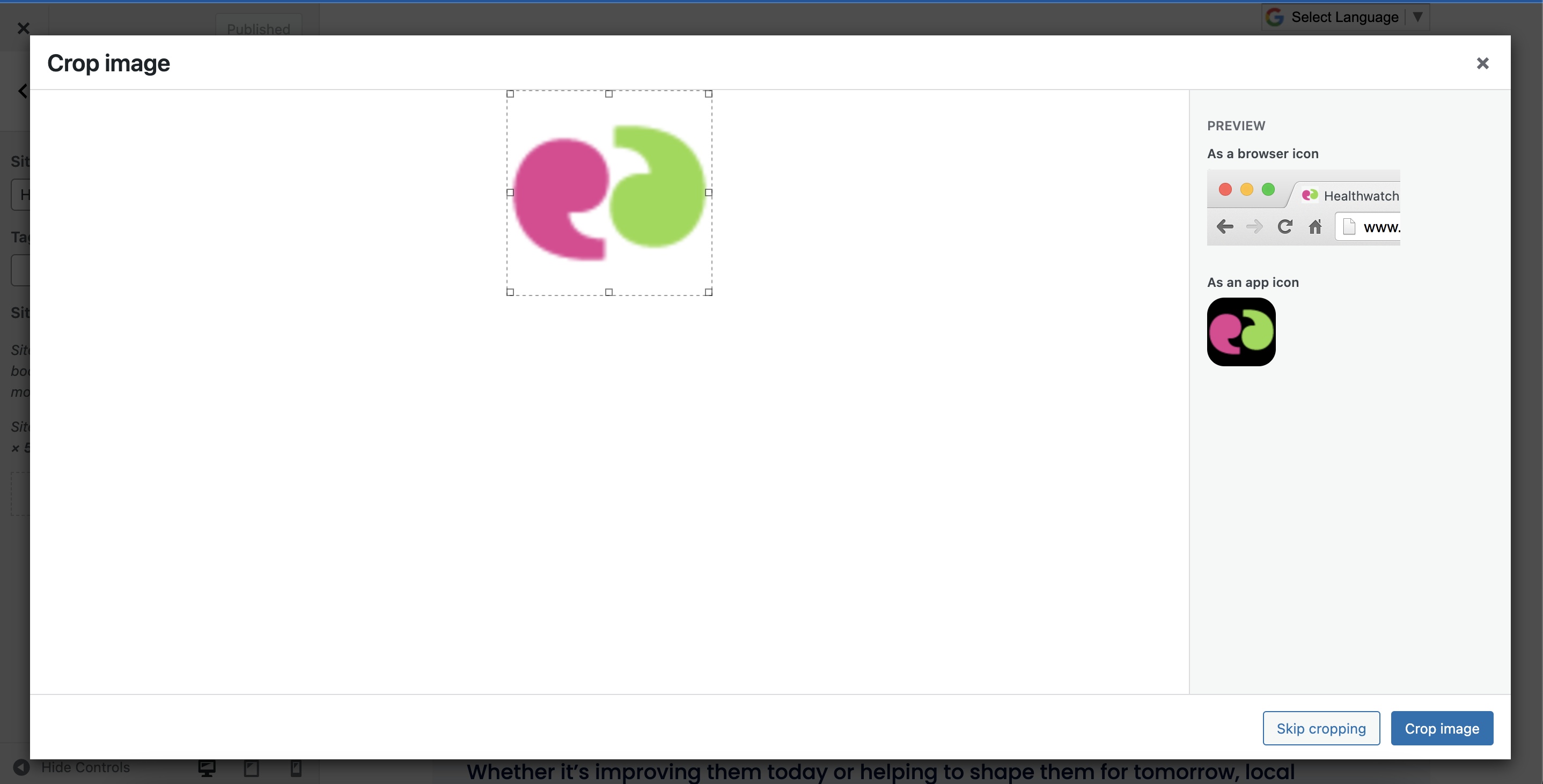 In this area you can crop it further or you can skip, but there is a preview of what the icon looks like on the right hand side. Click either 'Skip cropping' or 'Crop image' to continue.