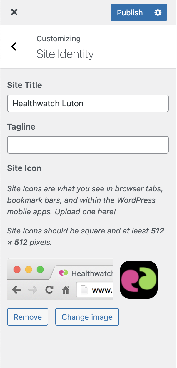 Once you've completed the upload, make sure you click 'Publish' at the top of this panel. Then you'll see you've successfully added your site icon as it will be displayed in the browser like so: