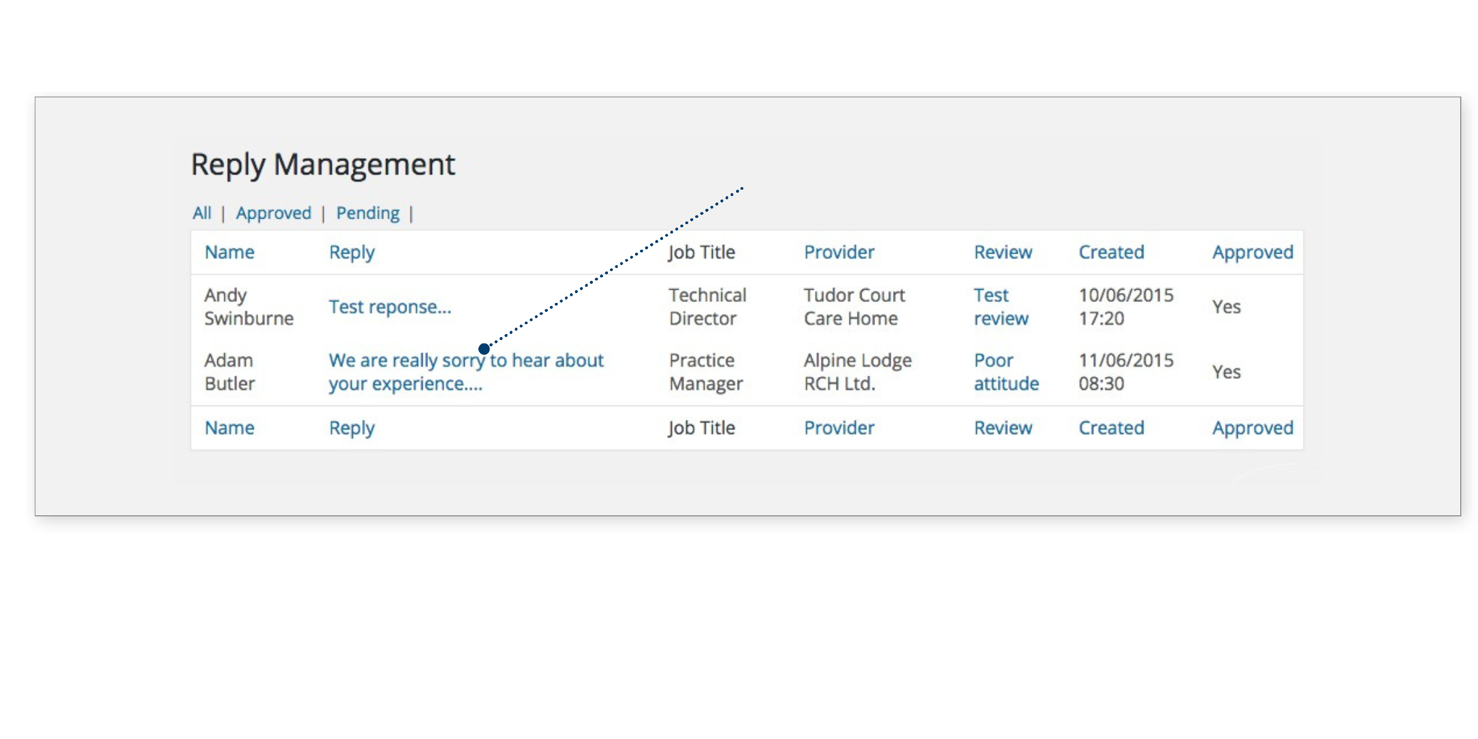 To moderate the provider response click on the “Reply Management” menu item in the CMS.