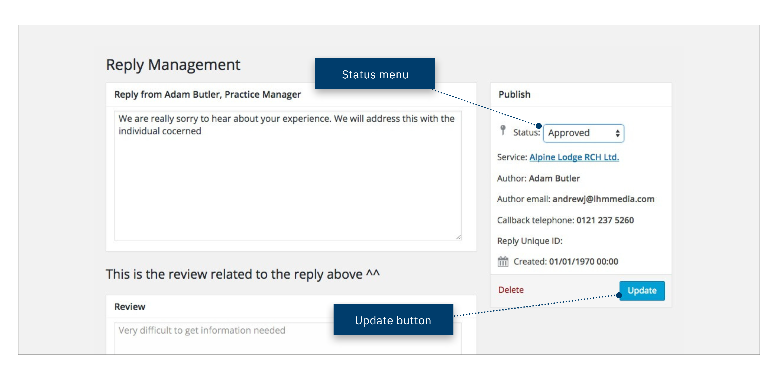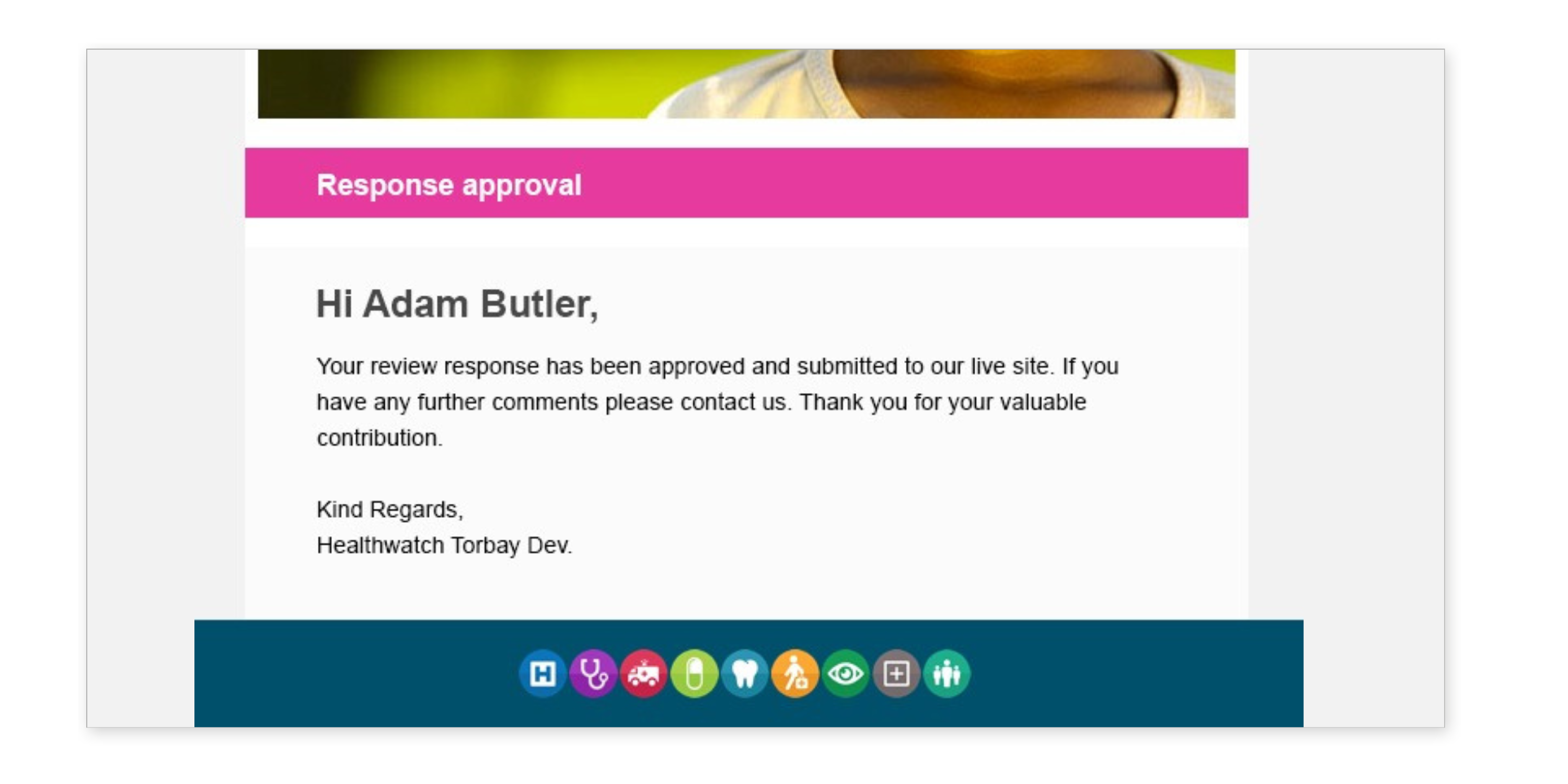 When the comment is approved by Healthwatch from the provider, the author of the original review is notified by email through your system that a response has been provided.