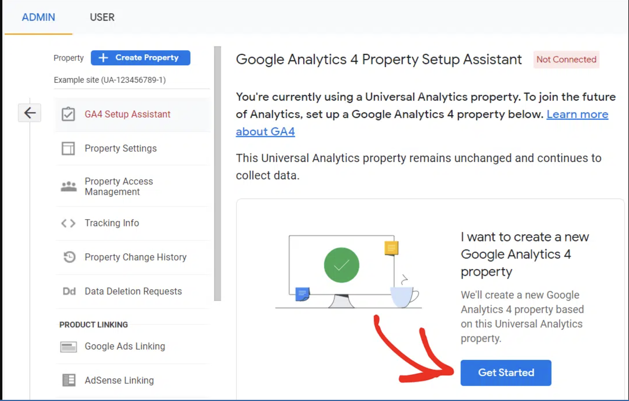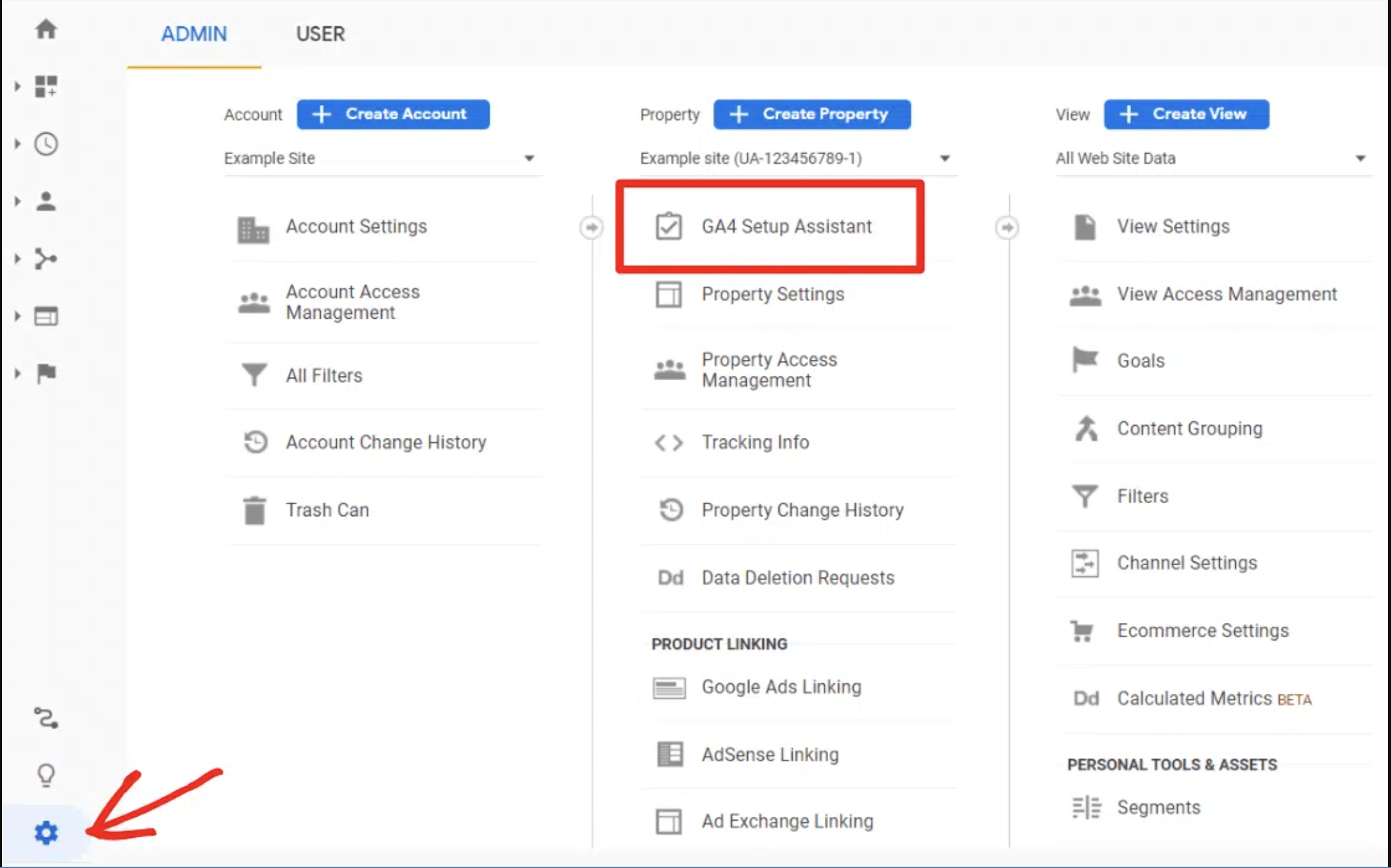 To access the assistant, head to the Admin cog then GA4 Setup Assistant in the middle column.