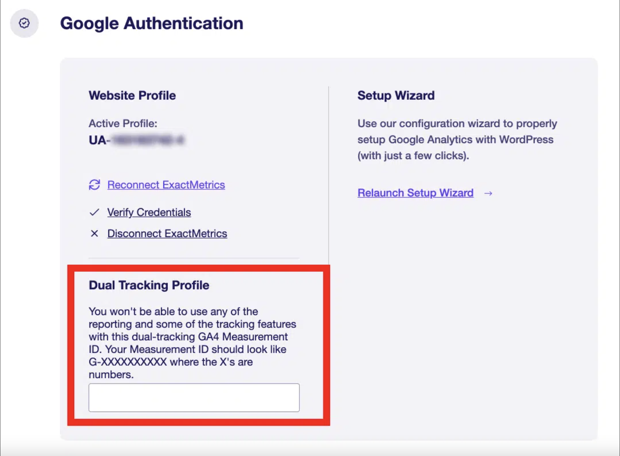 Under the Google Authentication section, you’ll see a Dual Tracking Profile option.