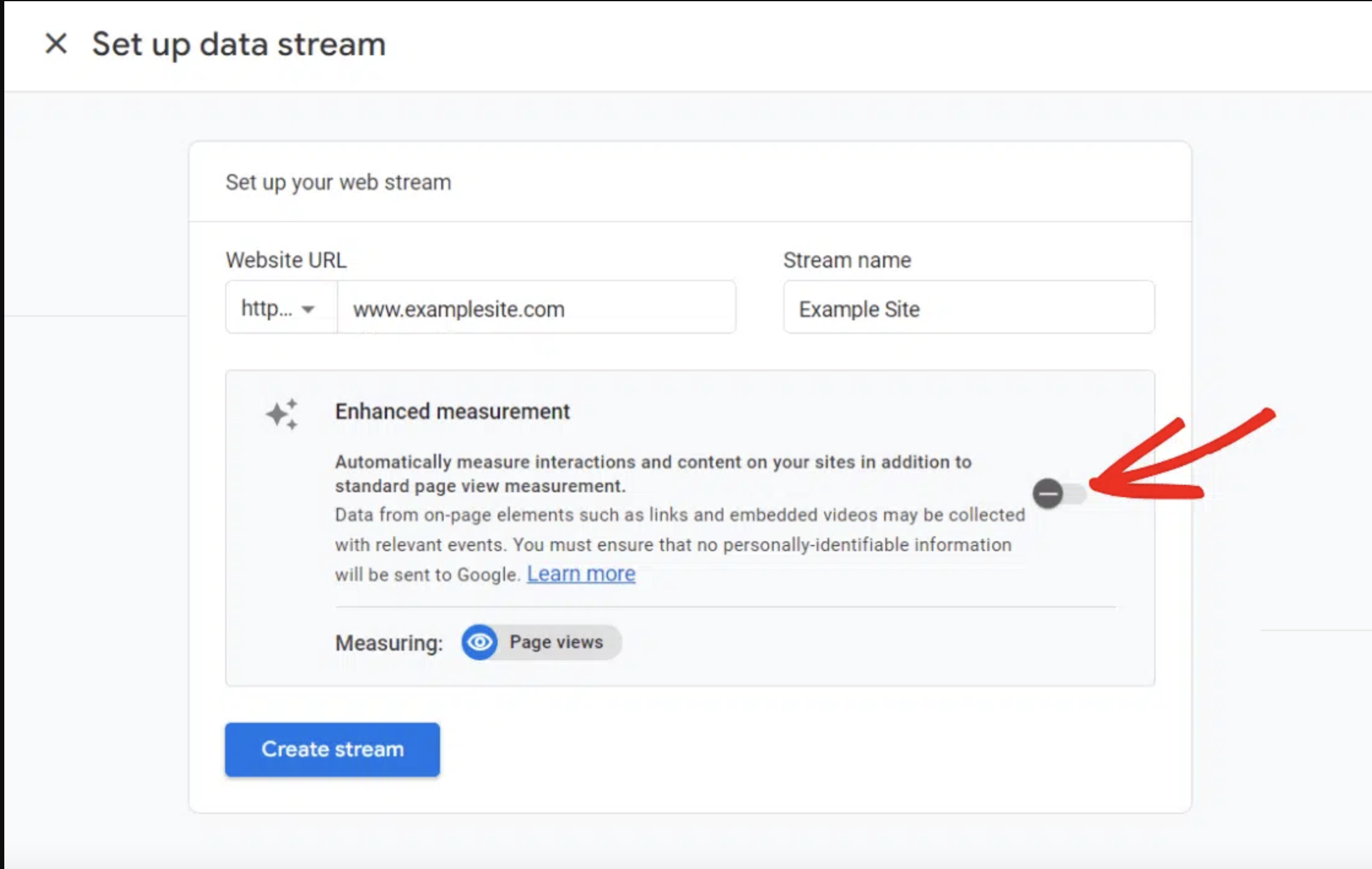 Now, turn Enhanced Measurement OFF. ExactMetrics tracks those events for you. Leaving tracking turned on in Google Analytics could disrupt your tracking through ExactMetrics.
